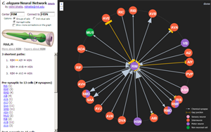 - wormweb.org - Simple web graph visualization of neural cell connections in the nematode. Nodes link to textual db entries with curation/experimental info. Made by Nikhil Bhatla, a current Brain and Cognitive Sciences grad student at MIT.