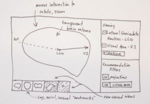 Above: This sketch suggests drawing all connection info in the spatial extent of a transparent 3D brain volume. To address the high visual complexity, a recommendation system helps the user filter and grow the visual circuit. Like the layers sketch, the user can snap to common views of the volume, or freely rotate/zoom on the brain and store these views.}