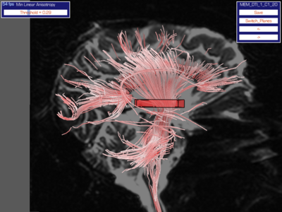 - Position the box medially in the fiber bundle so that it captures the full extent of the CST as it courses past the thalamus. The box should be situated approximately as follows: