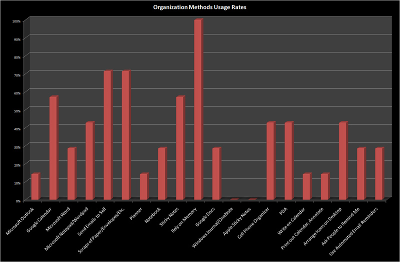 A histogram of methods people use to "stay organized" in terms of tracking things they need to do (TODOs), appointments and meetings, etc. is shown in the figure below.