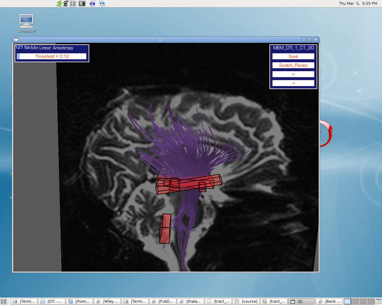 Error code: 127 | 1,280 × 1,024 (563 KB) | Jadrian Miles (talk | contribs) | Several Brainapp regions of interest to refine the selection of the Corticospinal tract (CST). Some ROIs select streamtubes, while others reject them. The set shown corresponds to the CST. |